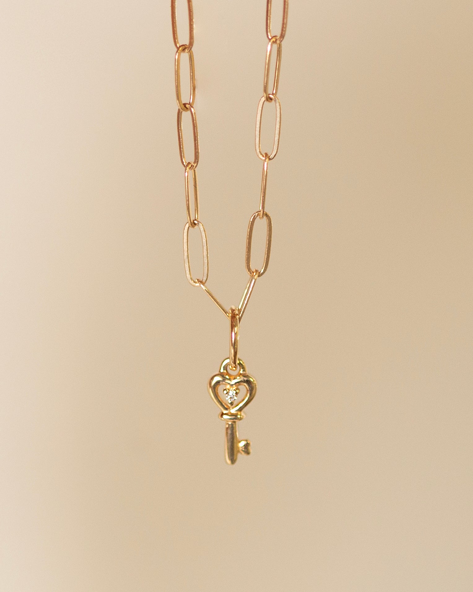 14K Gold Paperclip Chain Necklace with Diamond Key Charm
