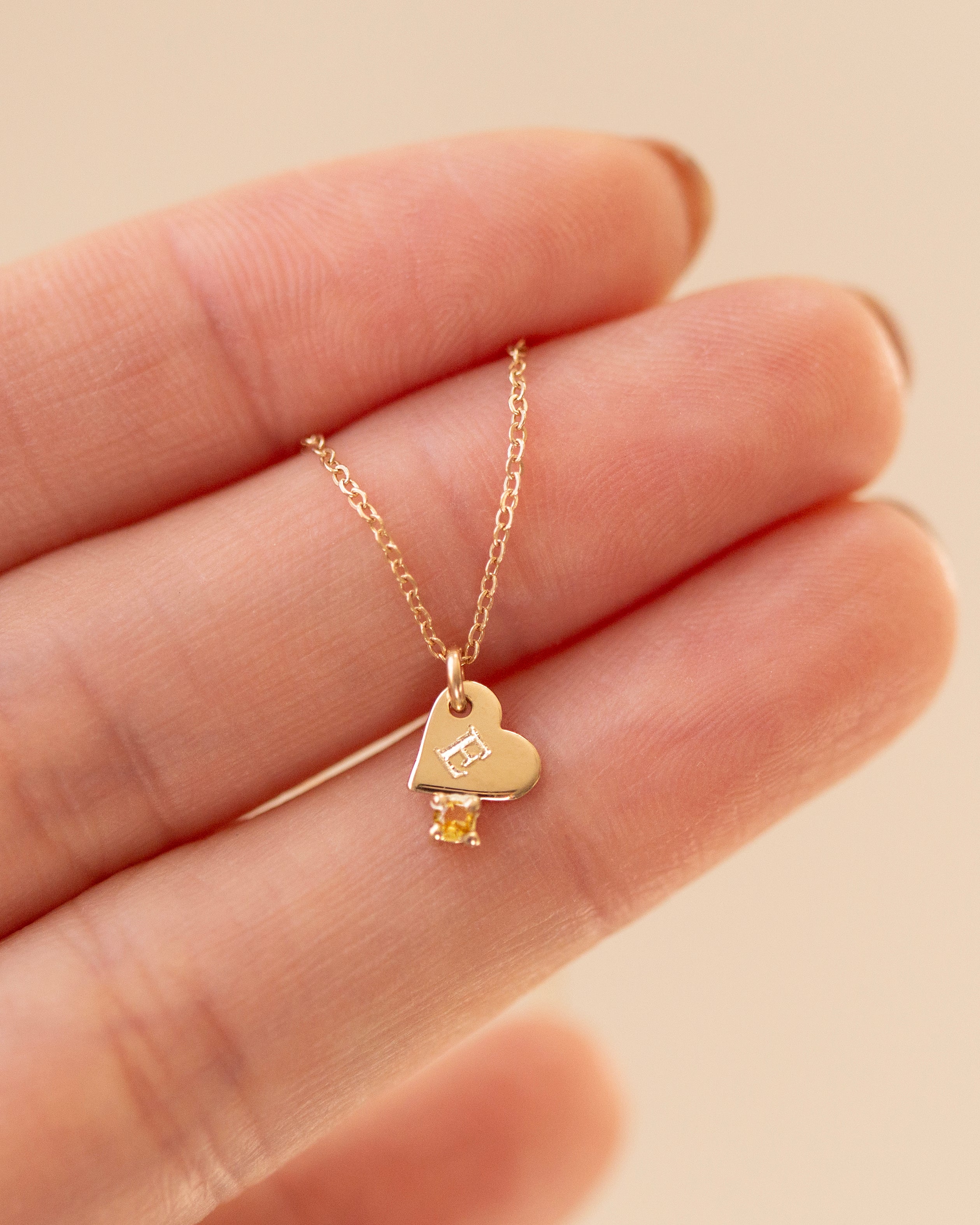 A timeless keepsake with a personal touch. This delicate necklace features a beautifully crafted 14k solid gold heart charm, perfect for everyday elegance or a meaningful gift. Customize it with one initial of your choice and a sparkling birthstone to represent yourself or someone special.