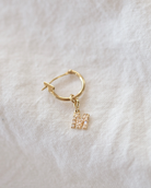 14k Gold snap hoop earring with diamond letter. Cute dangle diamond initial hanging from a dainty snap hoop earrings.• Purchase as a pair or single• 14k Gold genuine diamond• Approx. 12x1.25mm hoop. Diamond initial about 7mm