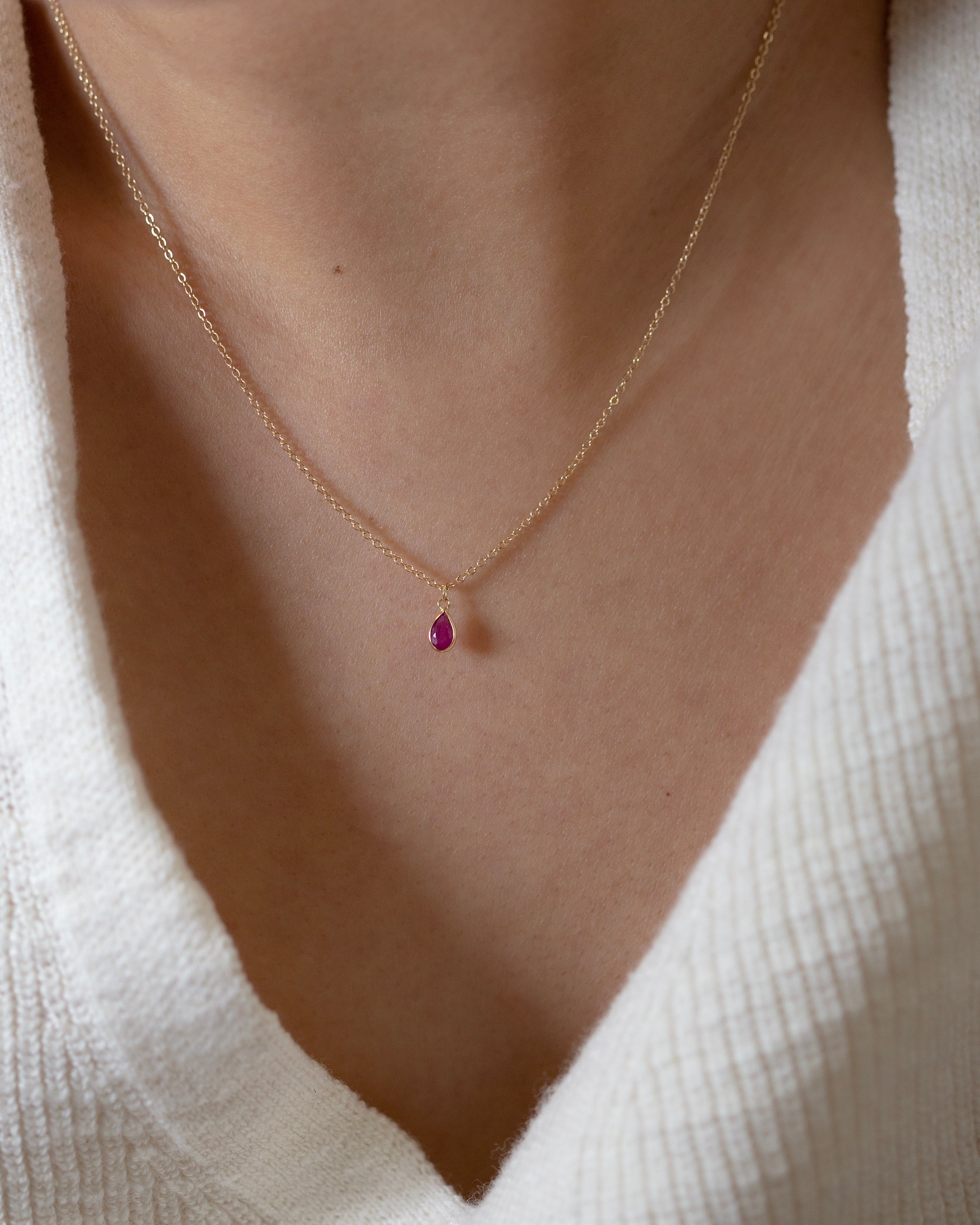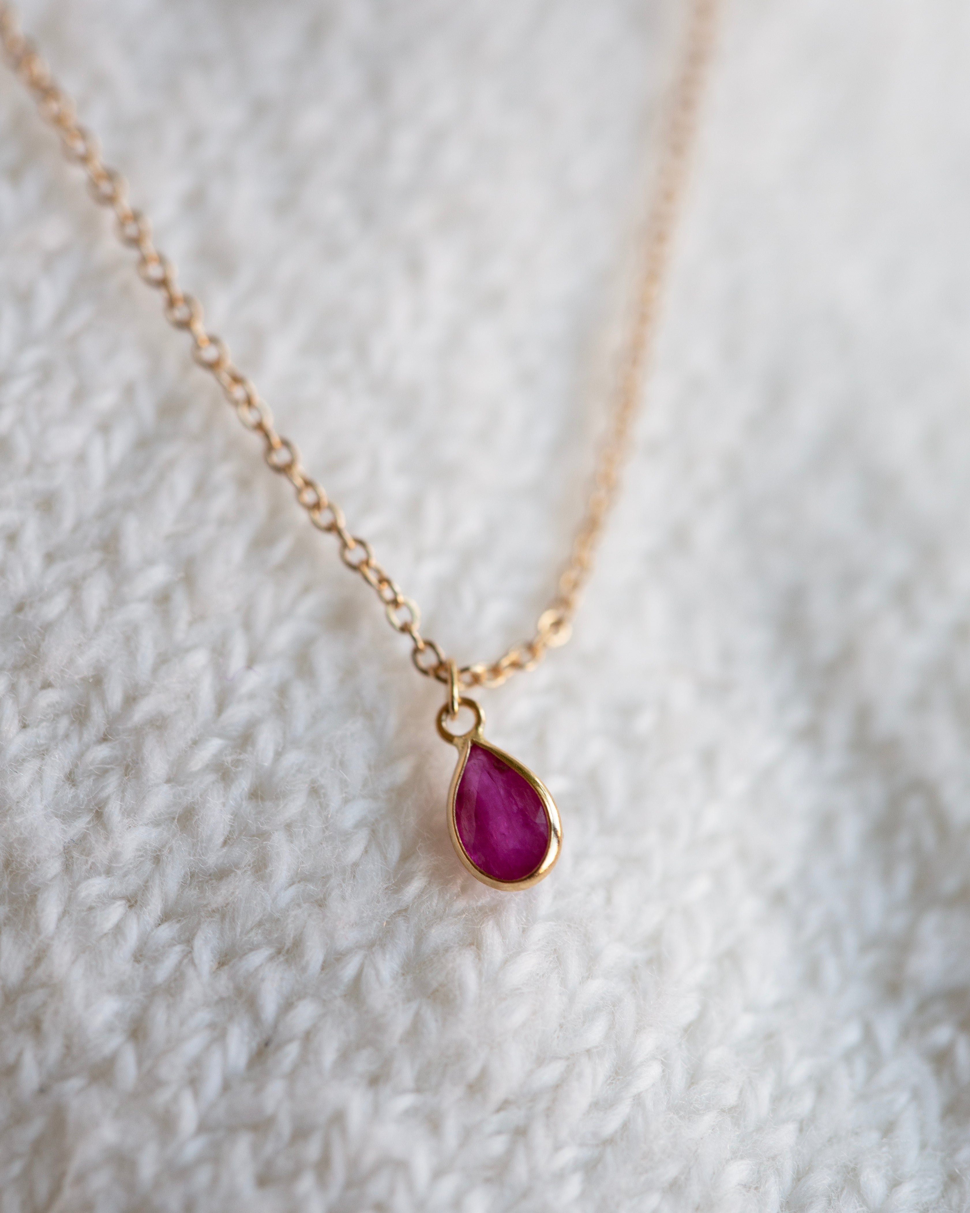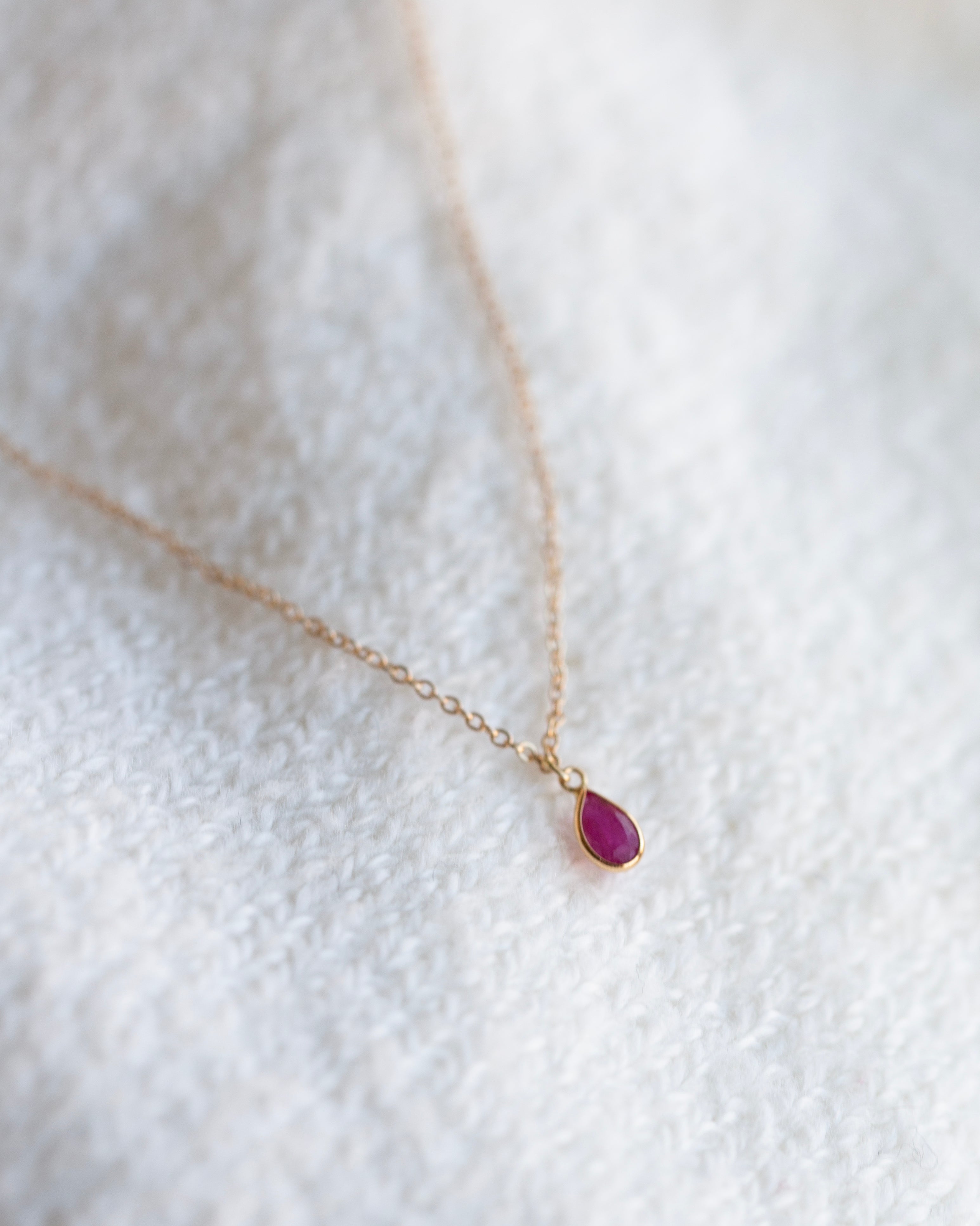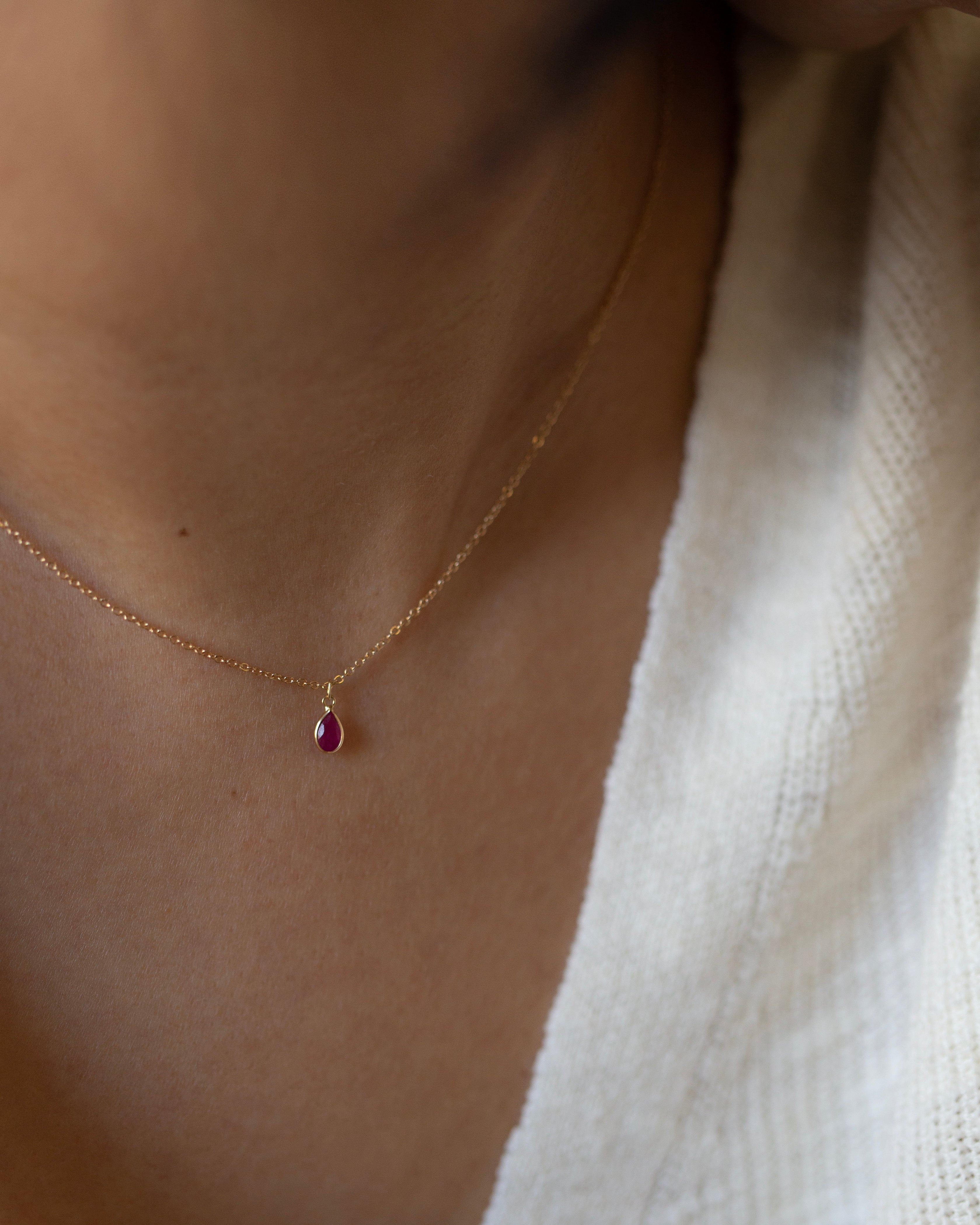 A teardrop shaped ruby stone on a delicate 14k yellow gold chain.