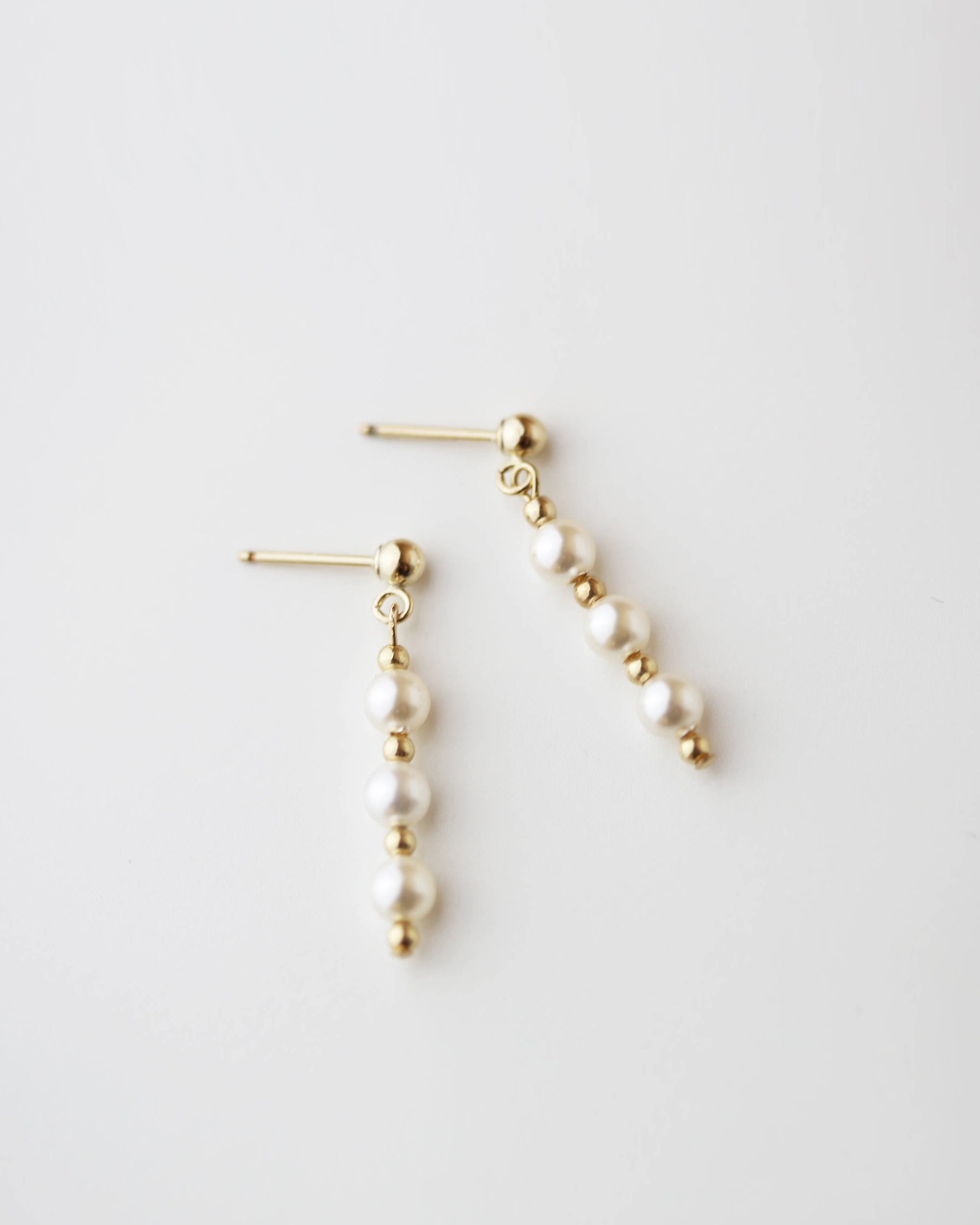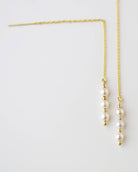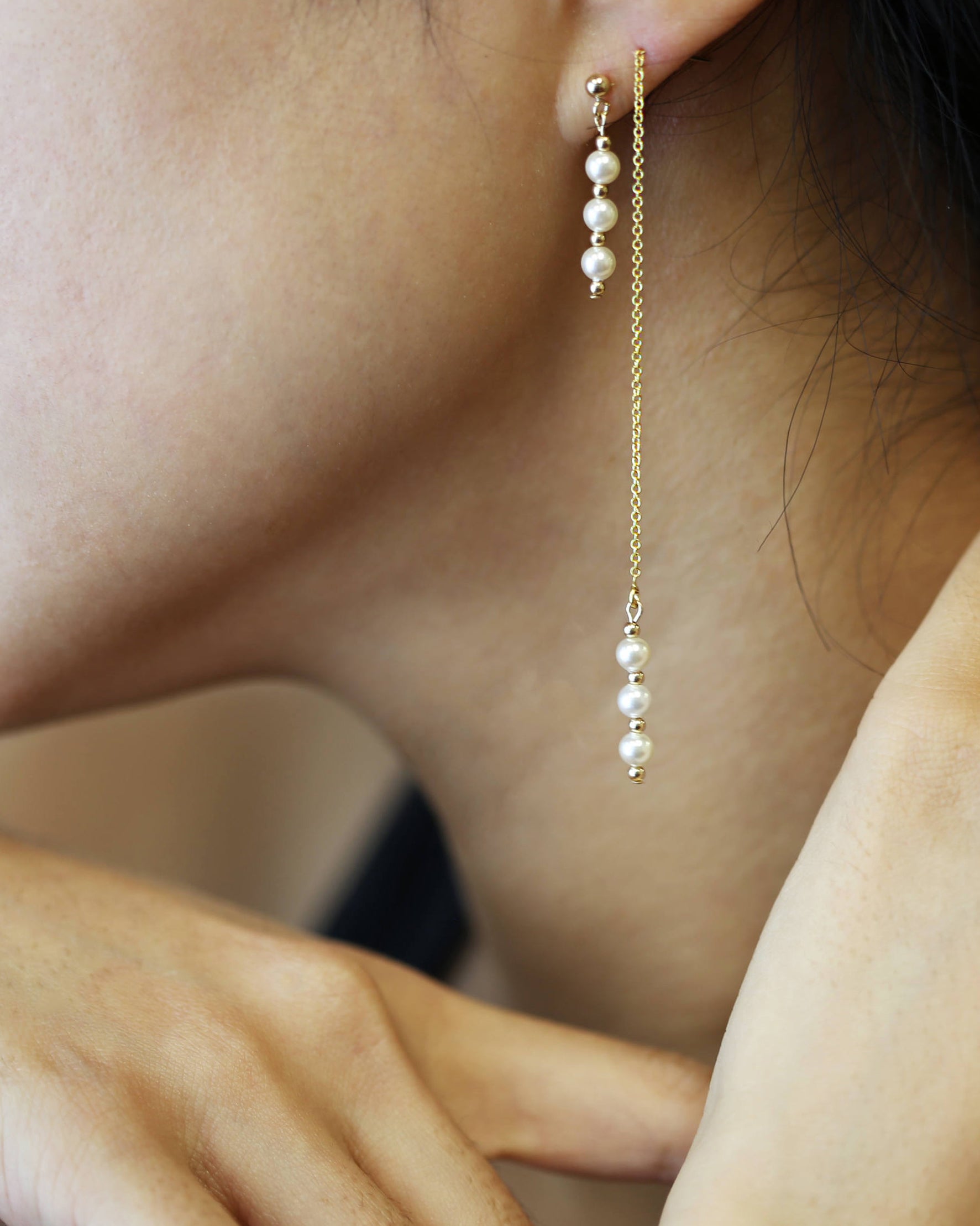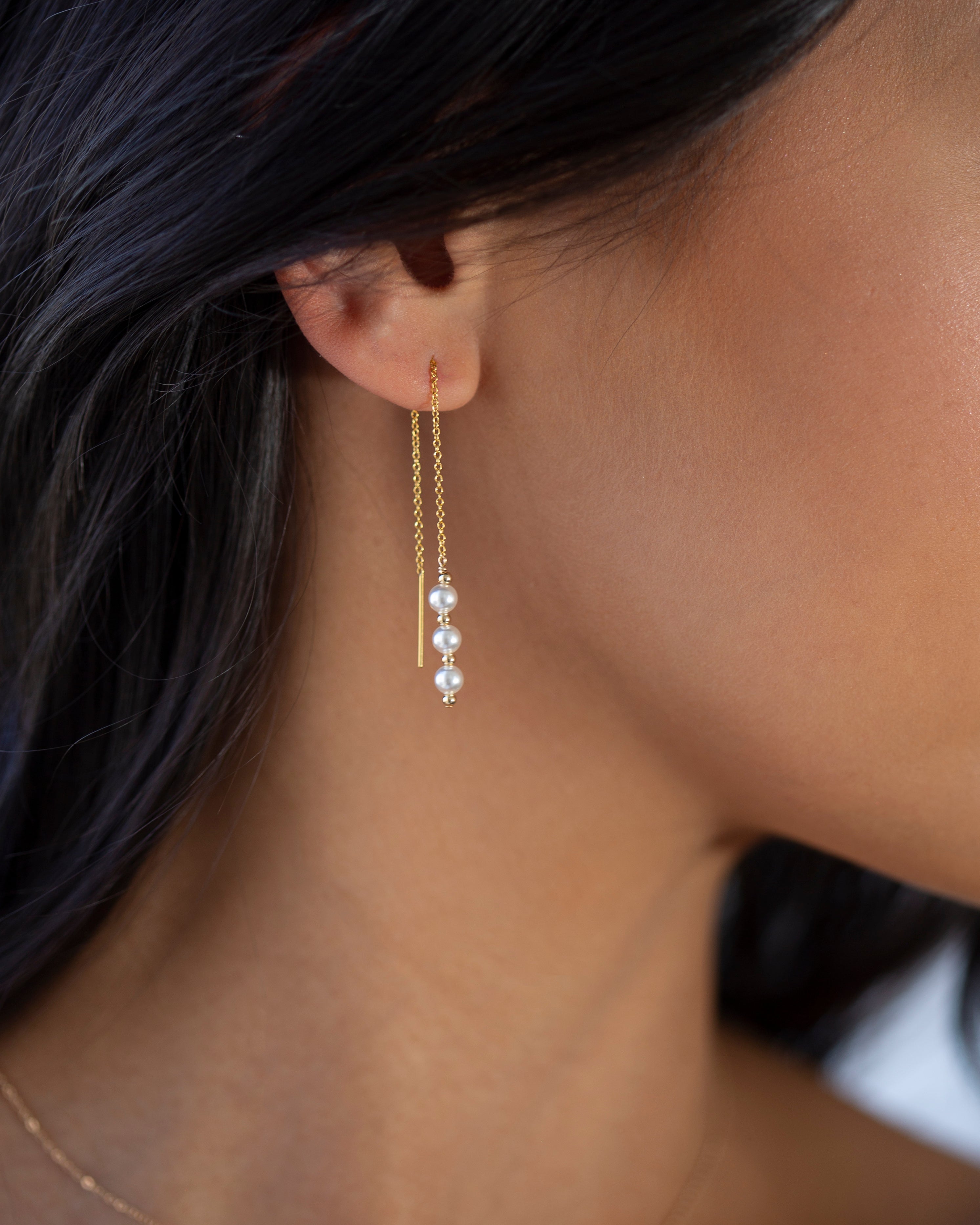 A stunning row of 3 pearls hang below delicate chain threaders and Studs. These pearls earrings are simply elegant and gorgeous!