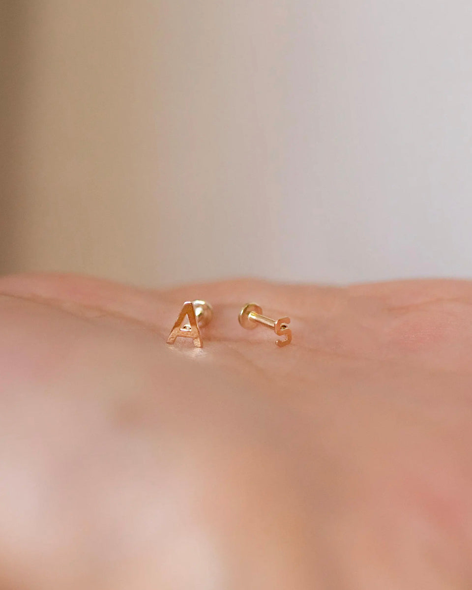 Add a personal touch to your jewelry with letter flat back earring. Perfect for cartilage, helix, Tragus, conch or lobe piercings, this piece blends a clean minimalist style with a personal touch. The combination of letter and number makes it great for representing initials, team numbers or special meanings.